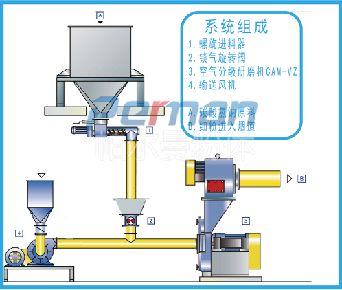 此流程中碳酸氫鈉從原料倉(cāng)通過(guò)變頻螺旋輸送機(jī)定量的供給下游的CAM-H系列空氣研磨機(jī)。所需的吸附劑的量可由脫硫前后的污染物濃度趨勢(shì)曲線計(jì)算。在螺旋輸送機(jī)和研磨機(jī)之間安裝旋轉(zhuǎn)閥,用于隔離氣流,以免氣流影響螺旋輸送機(jī)的定量進(jìn)料。碳酸氫鈉在分級(jí)磨中進(jìn)行研磨后,細(xì)粉由一臺(tái)物料輸送風(fēng)機(jī)輸送至煙氣管道。