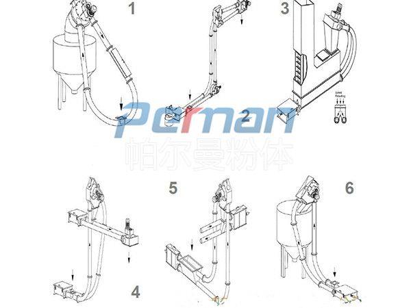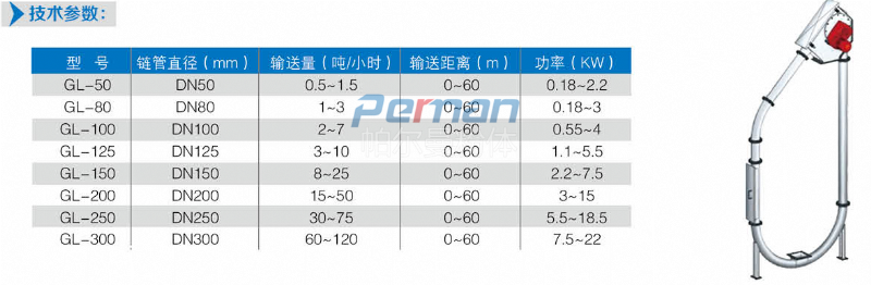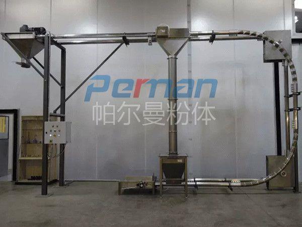 在密閉管道內,以鏈片為傳動構件帶動物料沿管道運動。當水平輸送時,物料顆粒受到鏈片在運動方向的推力,就隨鏈片向前運動,形成穩(wěn)定的料流;當垂直輸送時,管內物料顆粒受鏈片連續(xù)向上的推力,阻止了物料下滑,并產生了橫向側壓力,增強了物料的內摩擦力,當物料間的內摩擦力大于物料與管內壁外摩擦力及物料自重時,物料就隨鏈片向上移動,形成連續(xù)料流。粉體物料可在三維空間內沿封閉管道直線移動或改變方向;水平輸送距離可達60米,垂直輸送距離可達到30米。